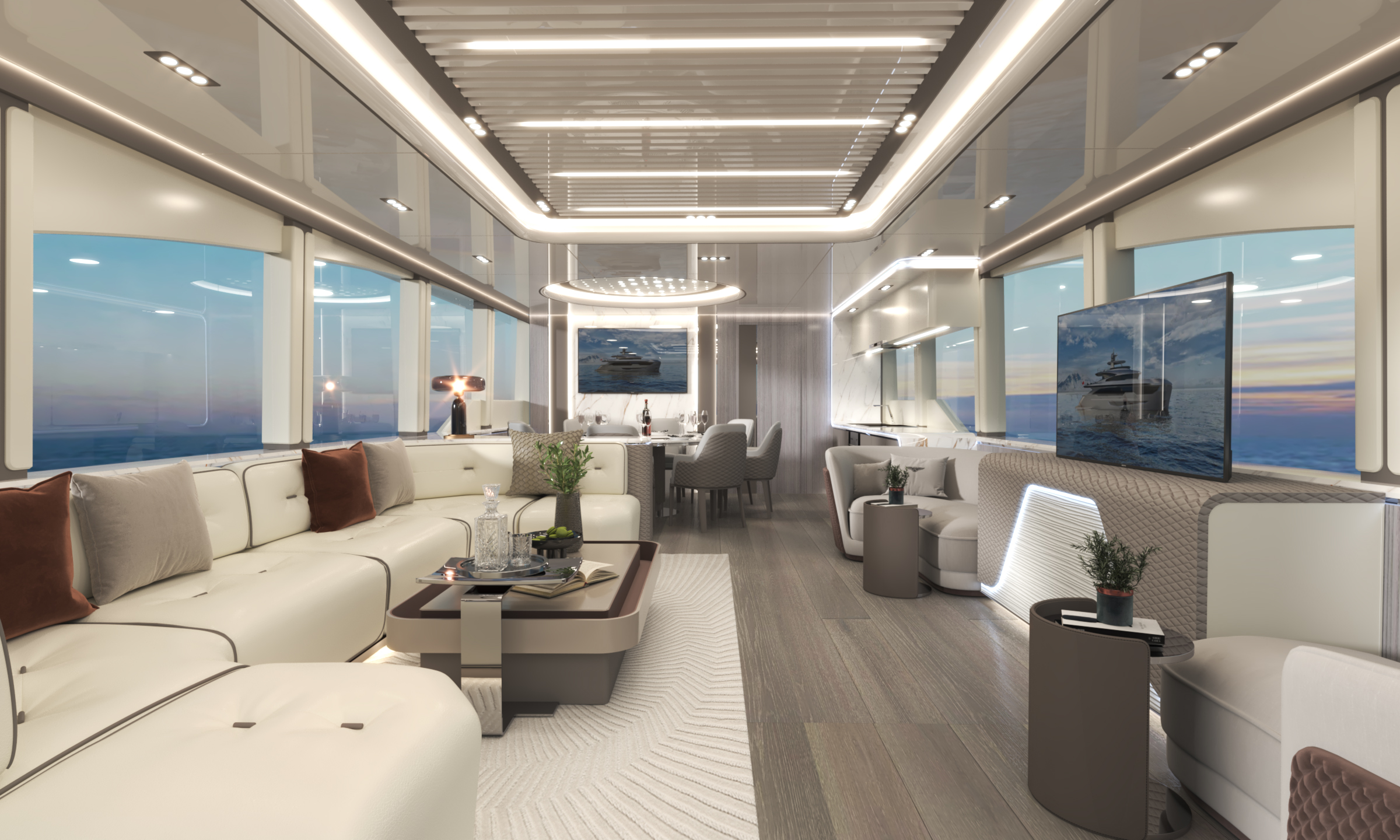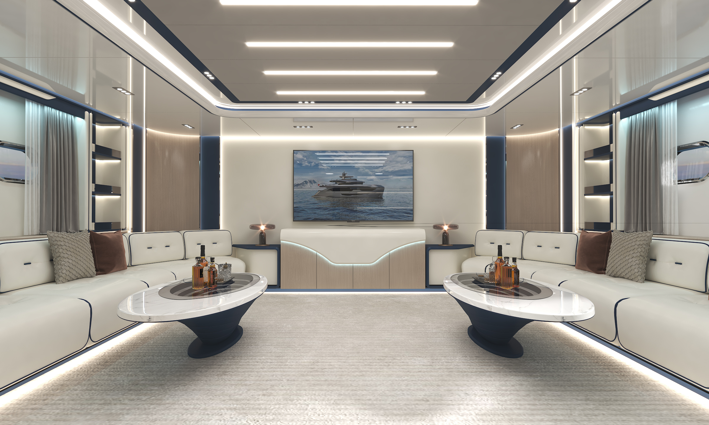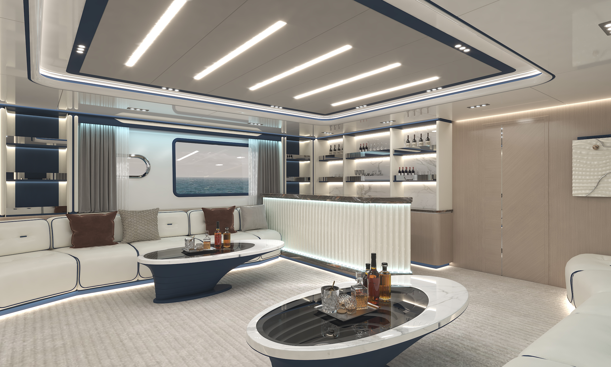 定制化的豪華商務(wù)沙龍廳,奢華與舒適的氛圍彌漫每一寸空間。細膩的皮革沙發(fā)、精致的木質(zhì)裝飾板以及柔和的燈光相互映襯,營造出溫馨而高雅的環(huán)境。巨大的窗戶將窗外的海景盡收眼底,藍色的海洋一望無際,海浪輕輕拍打著游艇,讓人在商務(wù)交流之余,也能盡情享受大自然的美妙。