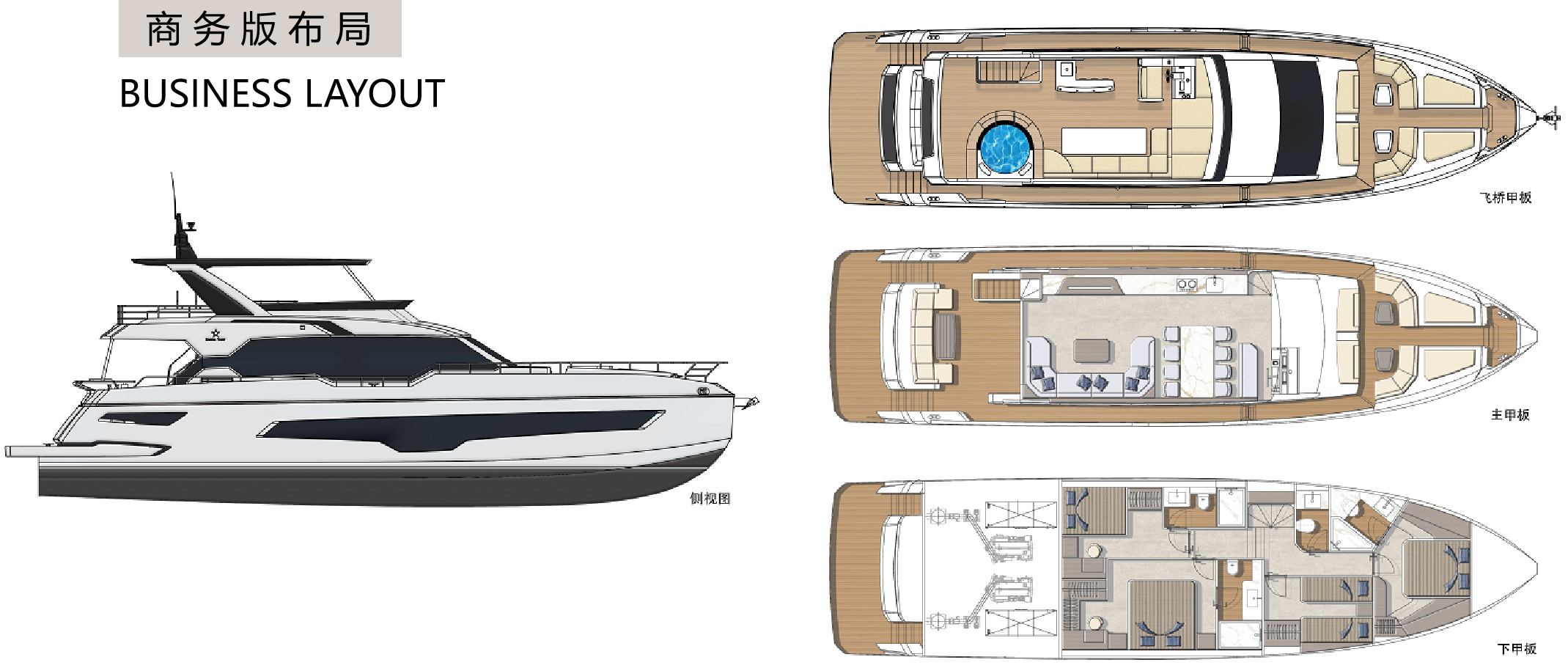 下甲板多功能廳,滿足美學(xué)和時(shí)尚的藝術(shù)理念,各種布局完美的局部設(shè)計(jì),更加增強(qiáng)了該艇外觀的現(xiàn)代型風(fēng)格。