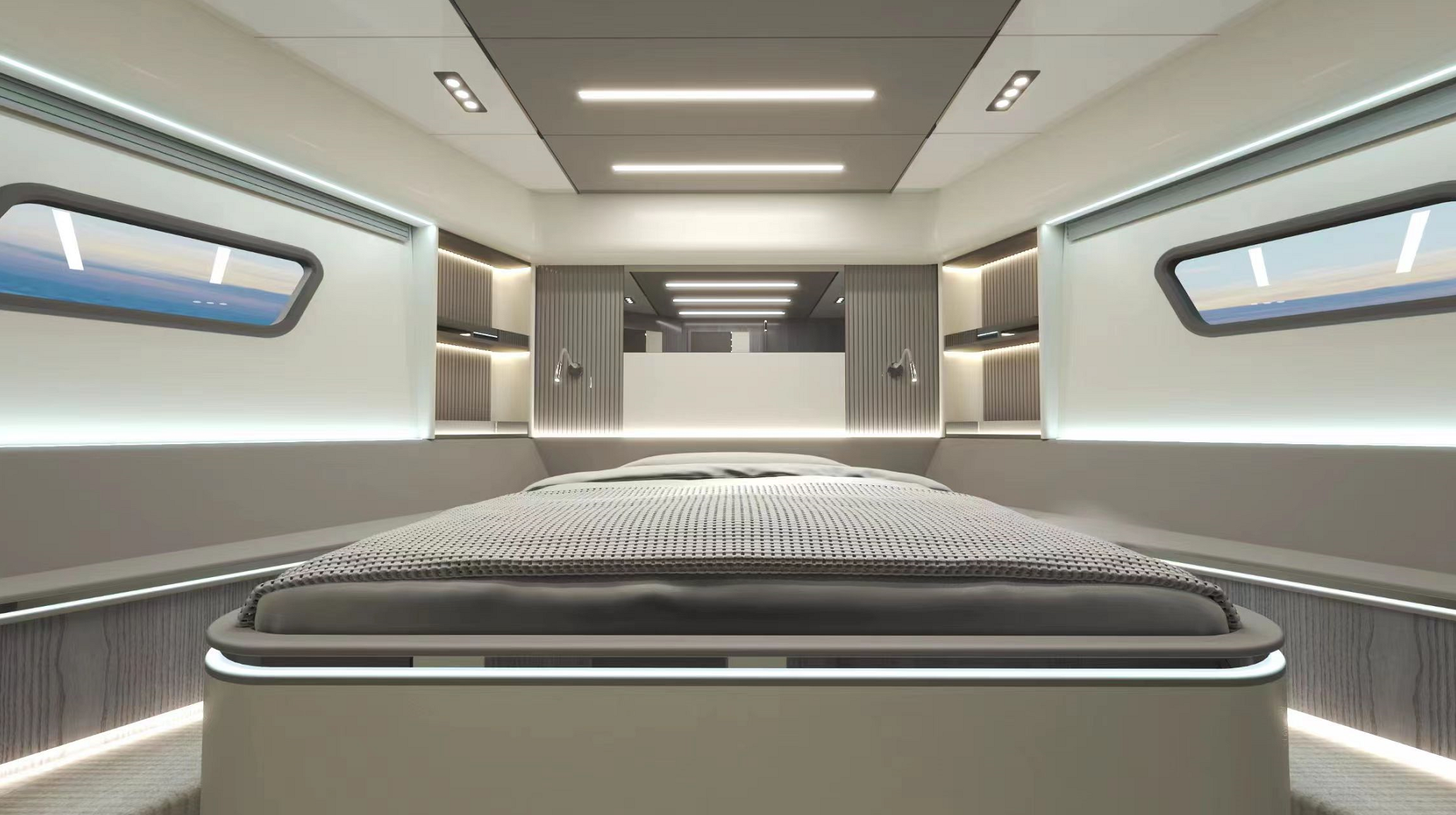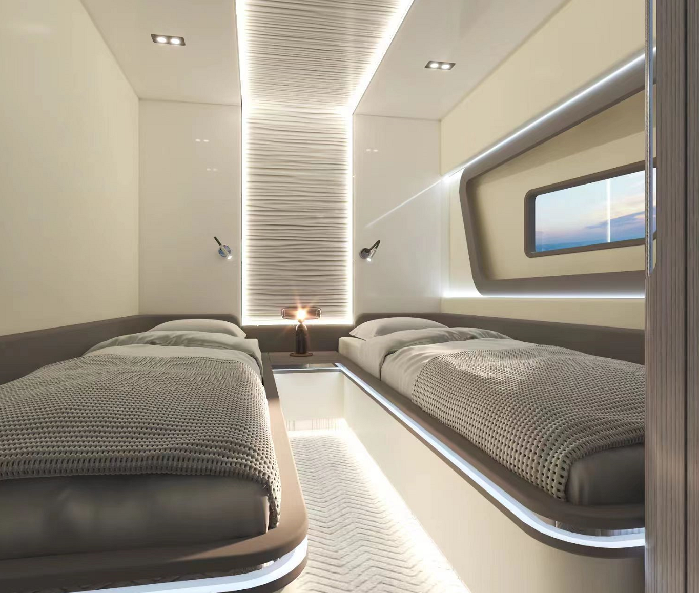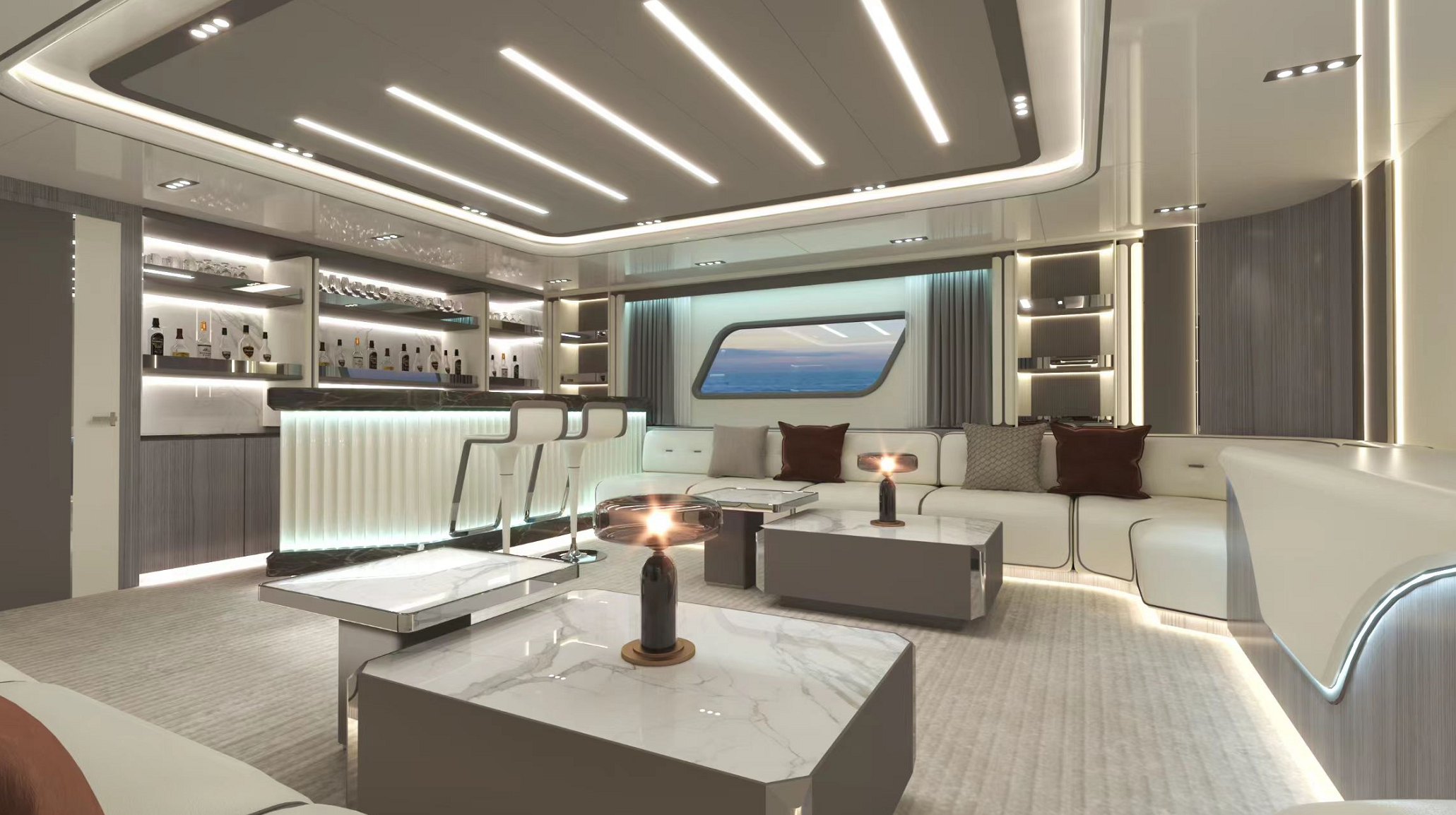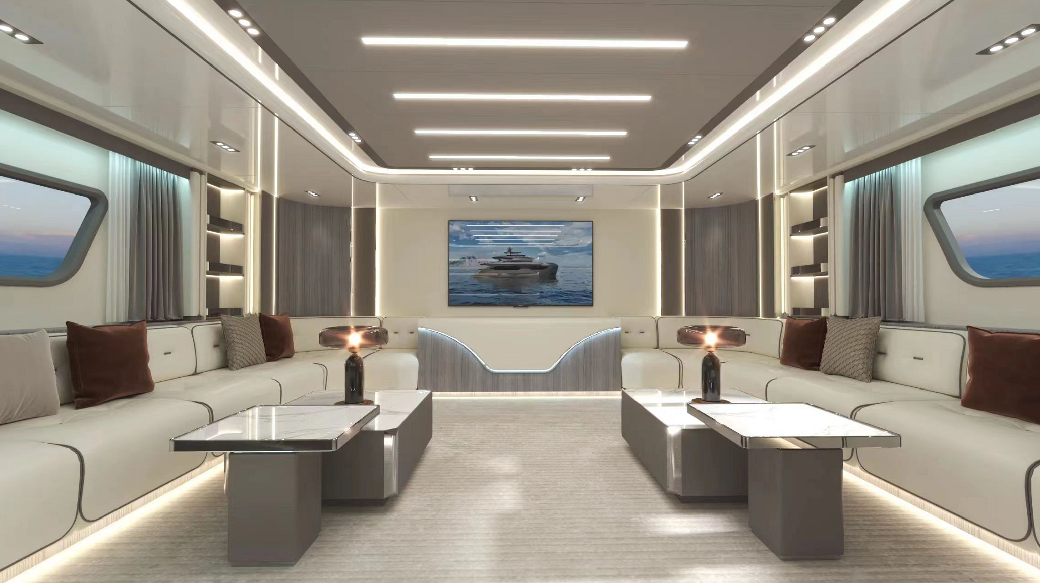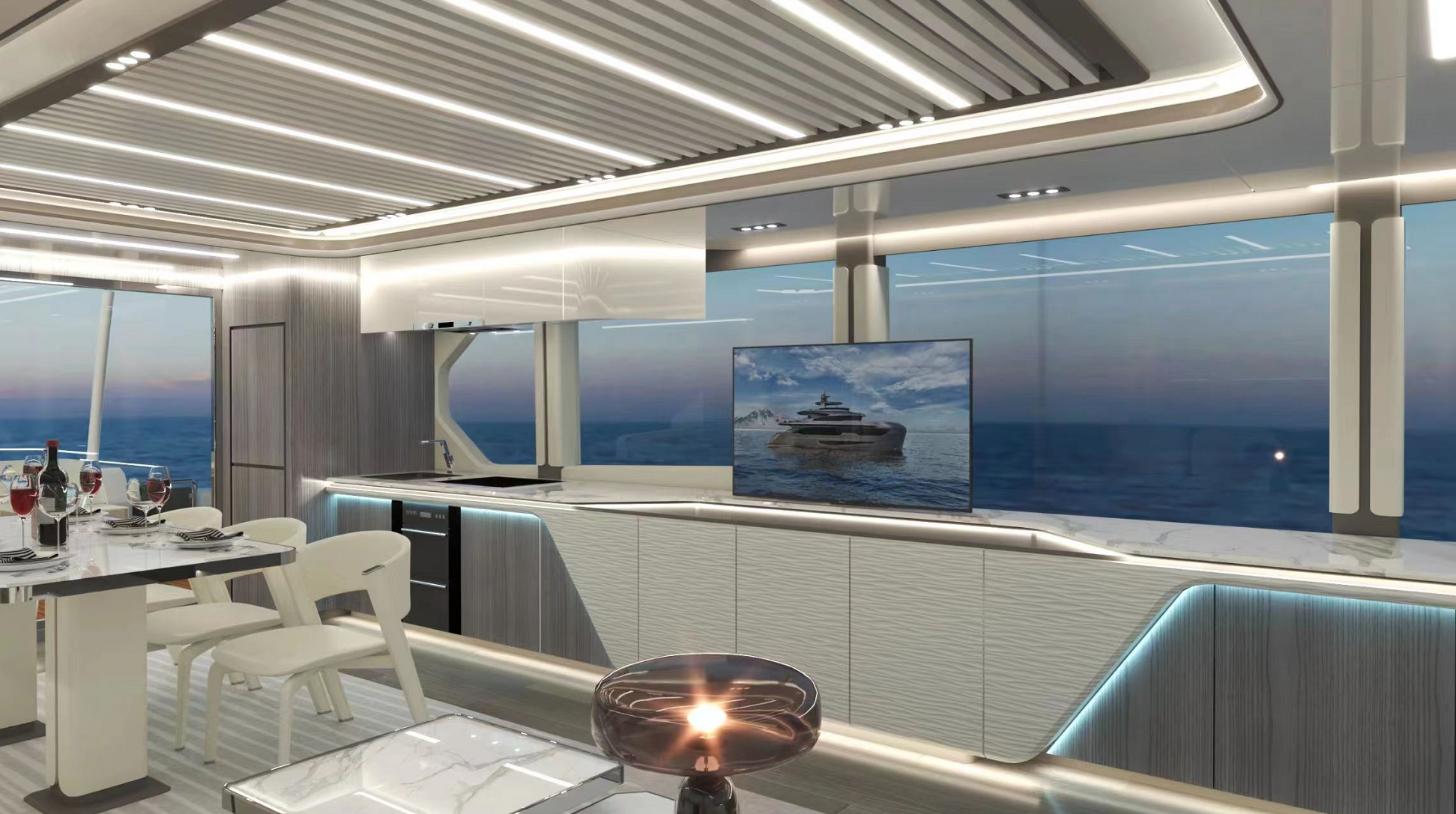 一體化定制的豪華商務沙龍,空間最大化,大窗戶審美設計同時也提升了甲板和內(nèi)部整體空間的通透性。私人定制廚房,鮮美海鮮,精致點心,多樣化烹飪方案,滿足各類商務招待。觥籌交錯,暢飲一杯,可獨飲,可歡聚,私人與派對的多重空間,自在選擇,自如品鑒。